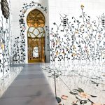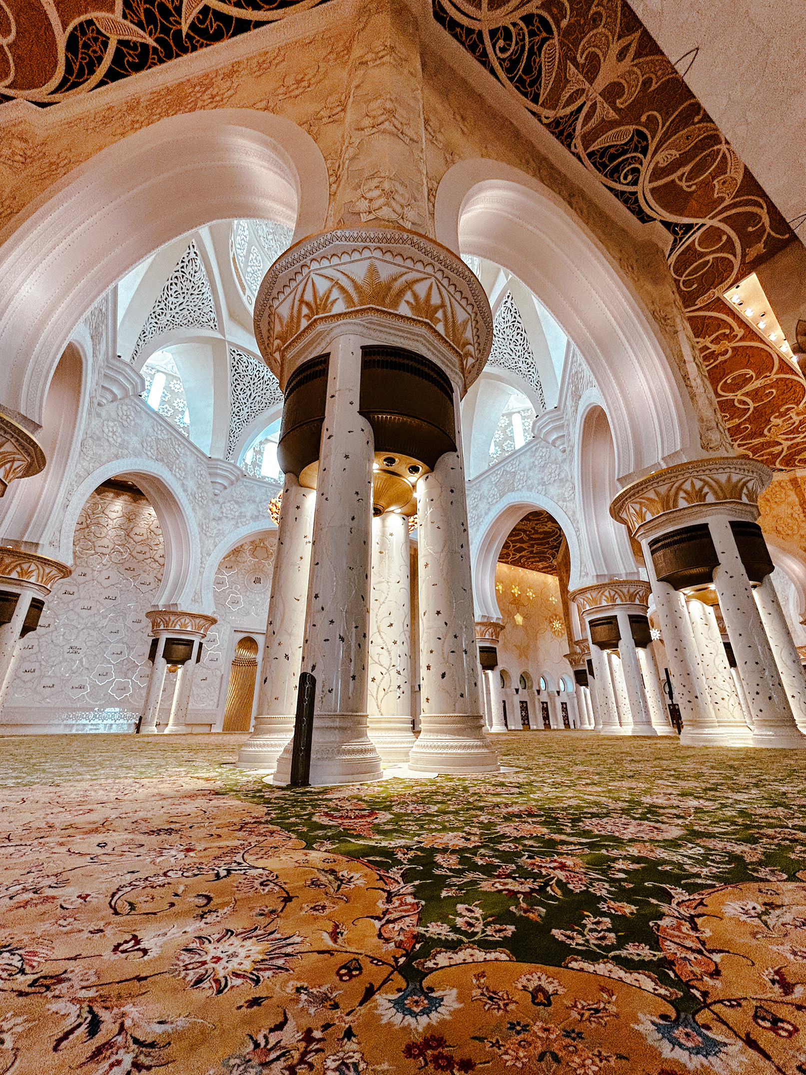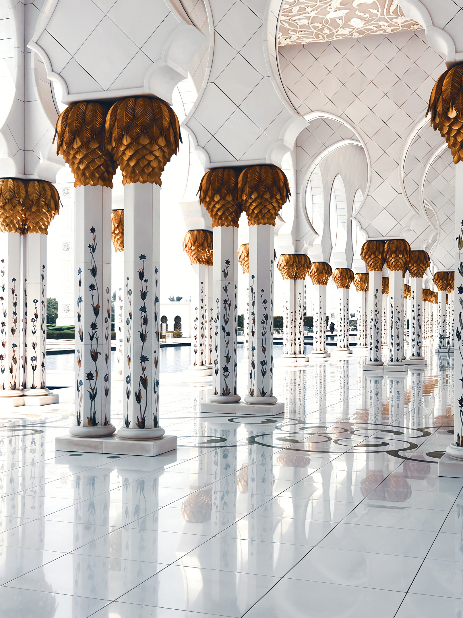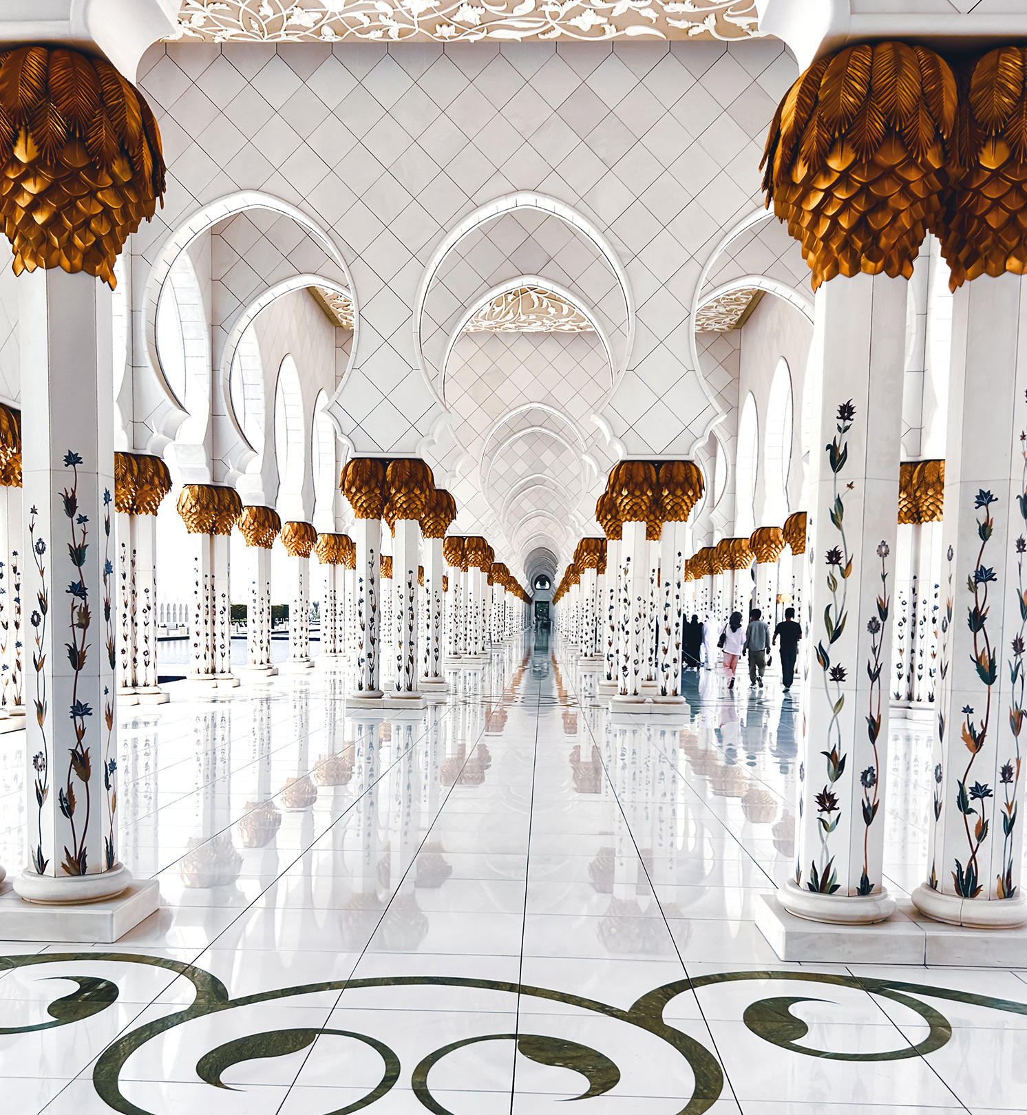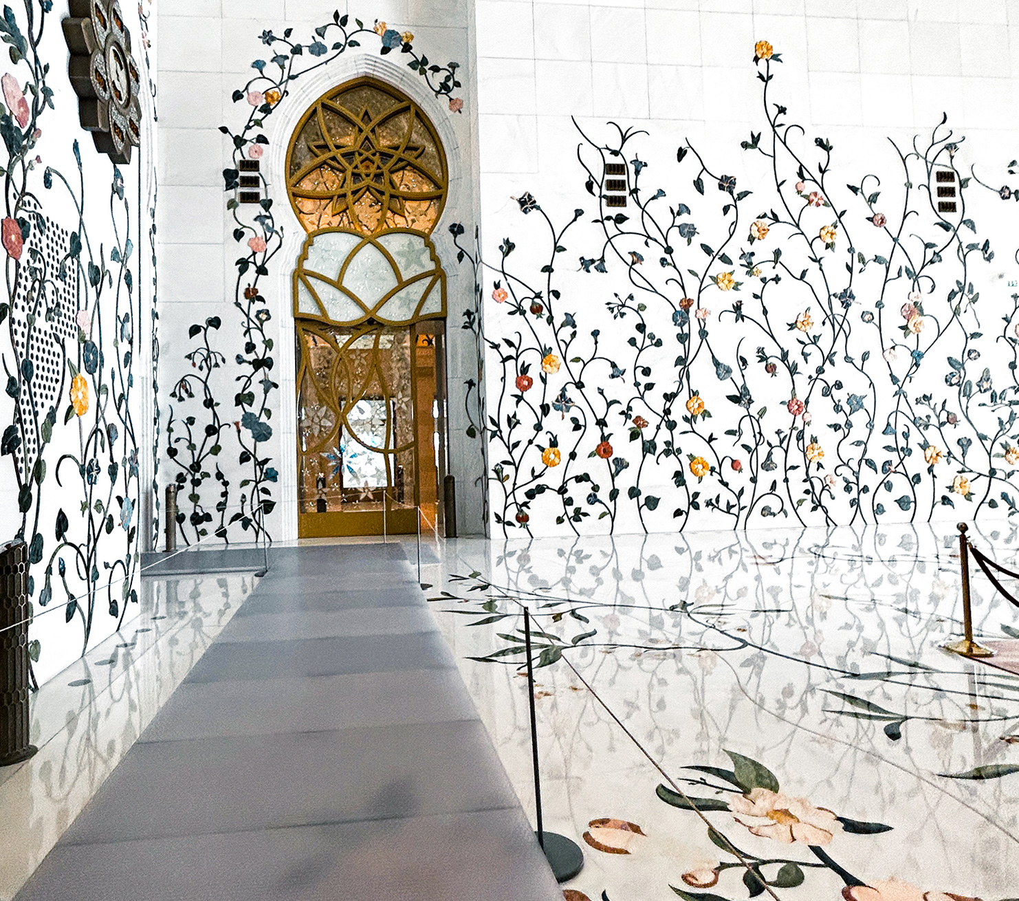 Die Sheikh Zayed Moschee wurde aus hochwertigem weißem italienischen Marmor erbaut und besticht durch ihre atemberaubende Architektur. Sie ist mit kunstvollen floralen Mustern verziert, die die Wände und Bögen schmücken, und wird durch goldene Akzente und Perlmutt-Details ergänzt. Diese Elemente verleihen der Moschee einen einzigartigen und ehrwürdigen Charme, der Besucher aus aller Welt anzieht.